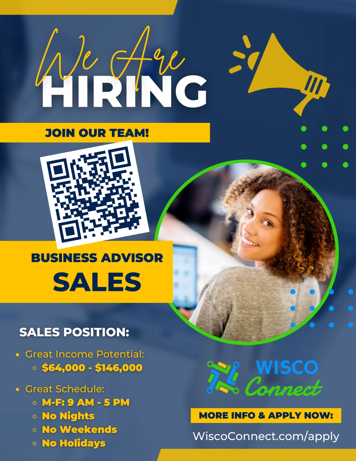 A Business Advisor will make contacts with local business owners and decision makers to schedule a free demo and consultation to show them how Wisco Connect can help them connect with their audience and grow their profits. Making connections is extremely important and that is a big part of the position, whether online or in-person. The other part is following up and actually closing (signing up) the client.